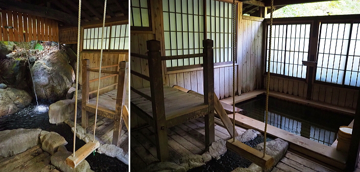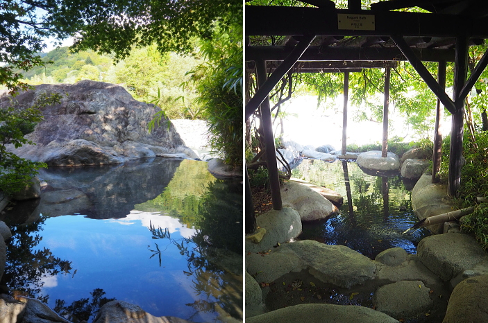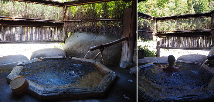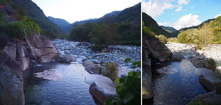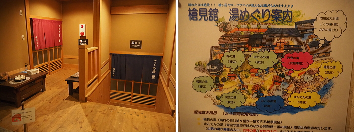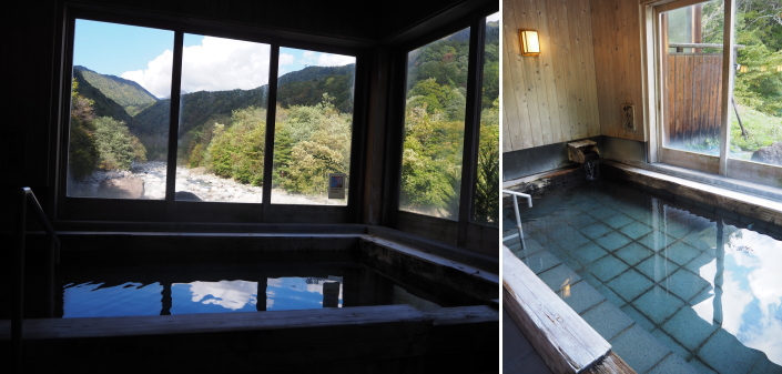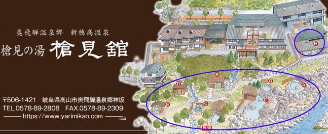 ![]() ![]() 新穂高温泉 槍見の湯 槍見館 【 温泉編 】 ![]() 槍見館の温泉 (内湯・露天風呂 丸印) 循環・塩素消毒を一切行わない良質かけ流しの名湯です。 ■泉質:単純温泉/炭酸水素塩泉(自家源泉1本、共同源泉1本) 効能:神経痛・筋肉痛・冷え症・リウマチほか 槍見館では56℃の温泉の温度を熱交換器を用いて10℃ほど下げている。 熱交換で生じる温水は上がり湯などで使われている。 槍見館の浴槽は、ごての湯(男湯)、かかの湯(女湯)と名付けられた内湯と、 蒲田川に沿って庭内に設けられた7つの露天風呂に足湯を加えて全部で10箇。 槍見の湯、まんてんの湯は混浴露天風呂、岩見の湯は女性専用、 渓流の湯、森の湯、播隆の湯、ほたるの湯の4箇所は貸切露天風呂、 それに、なごみの湯と名づけられた足湯がある。 ![]() 槍見の湯(A) 混浴露天風呂 混浴露天風呂専用の「湯あみ着」があります。 ※7:00〜9:00は女性専用。 その名の通り浴槽から槍ヶ岳が見える露天風呂。 晴れた日には蒲田川の上流の先に突き立つ槍ヶ岳の尖峰が見える。 ![]() 左画像 「まんてんの湯」(F) 男女別兼用の混浴露天風呂で、槍見舘で最も歴史のある湯船。 右は、もっと奥にある足湯 ![]() 内風呂を通らずに、ロビーから階段を降りると貸切露天風呂に行けます。 ![]() ![]() 貸切露天風呂 ほたるの湯(B) 貸切露天風呂の入り口に札が掛かっているので、ご利用時に札を外して「入浴中」の表示とし、 外した札は扉の内側に差し込んで鍵として利用します。 空いていればいつでも利用可能。 ![]() 貸切露天風呂 渓流の湯(C) ![]() 貸切露天風呂 森の湯(D) ![]() 貸切露天風呂 幡隆の湯(E) ![]() 本館奥にある内湯 : ごての湯(男湯)、かかの湯(女湯) ![]() ごての湯 ![]() 内湯とはいえ、ごての湯からも窓を開ければ槍ヶ岳を望むことが可能です。 温泉三昧の旅行でした!! |